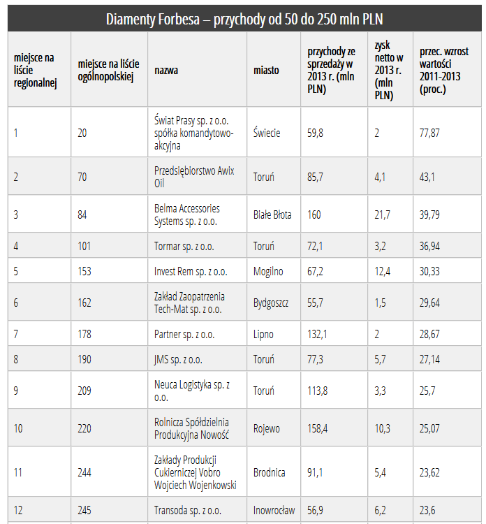 Świat Prasy został regionalnym liderem Diamentów Forbesa w kategorii przedsiębiorstw o przychodach 50-250 mln złotych. W województwie kujawsko-pomorskim znajdujemy się na pierwszym miejscu, na liście ogólnopolskiej zajmujemy dwudziestą pozycję.